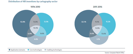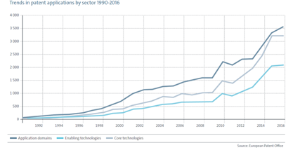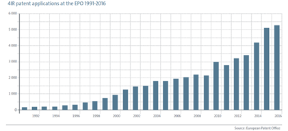 Through studying patent applications, it is possible to observe the emergence and development of the scientific developments and influential technologies which are main drivers of the 4IR. The European Patent Office (EPO) recently published an extensive landscaping study relating to patents and the 4IR, highlighting main innovation trends.